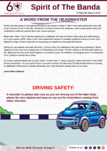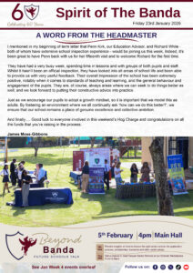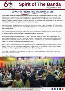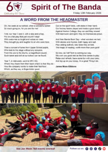 It’s a busy weekend ahead with our girls’ Under 13 and Under 11 hockey players in action at Kenton in their IAPS hockey tournament – the very best of luck to everyone involved. We also have The Banda Ball tomorrow evening in celebration of the school’s sixtieth anniversary and I look forward to seeing many of you there.